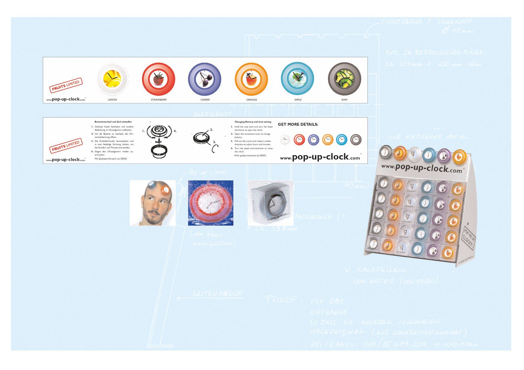 Für die Werbemittel-Uhr-Linie "pop-up-clock" habe ich über Nacht ohne Bildmaterial ein Leporello-Booklet gezaubert. Das POS-Display habe ich ebenfalls entwickelt. Fotos: migukagerah