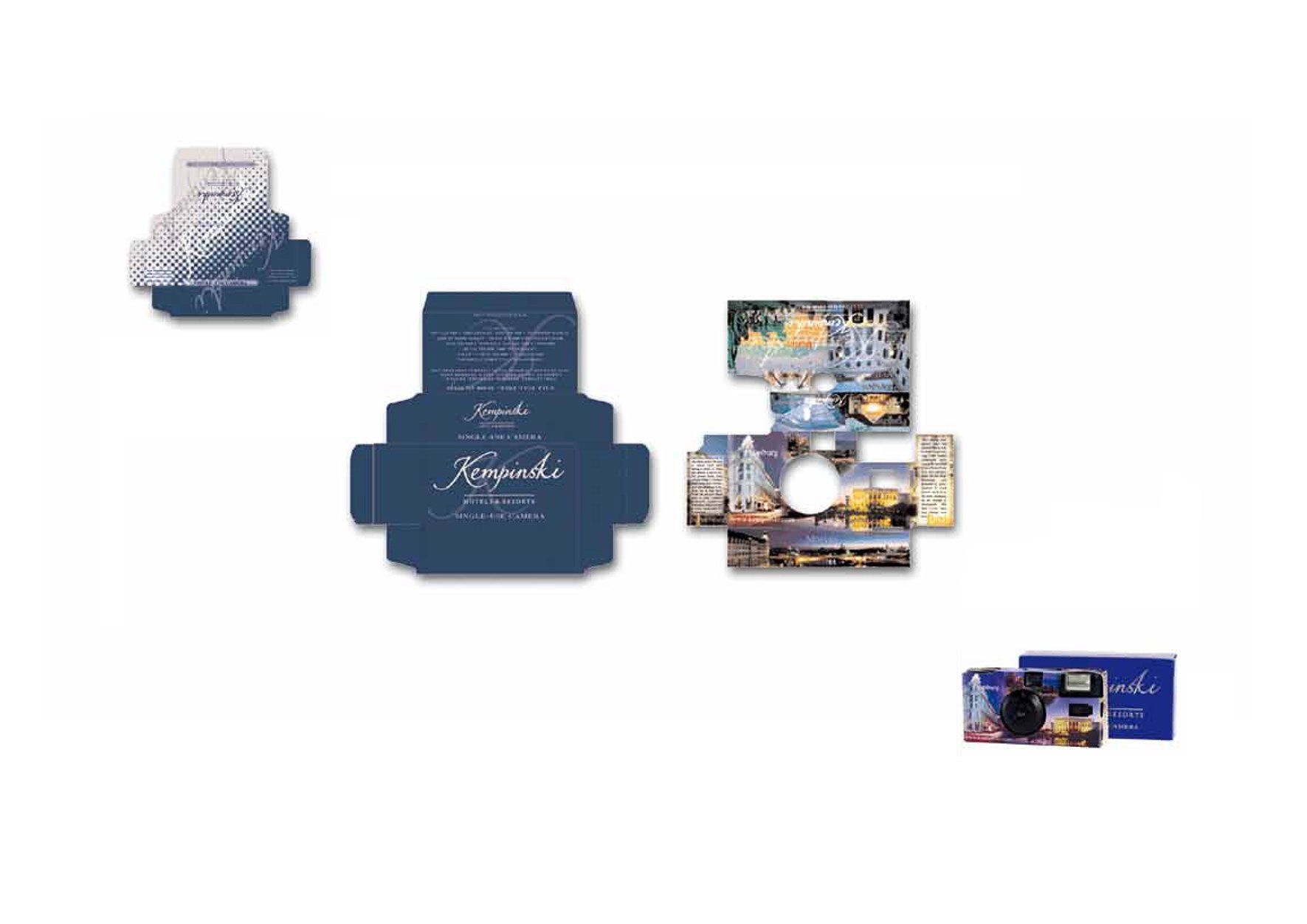 Gewonnener Pitch um die Gestaltung einer Einweg-Kamera für #Kempinksi Hotels aus der Zeit vor der Digitalfotografie für alle. Links oben eine Alternative, die aber nicht umgesetzt wurde. #Verpackung #Layout #design # #reinzeichnung